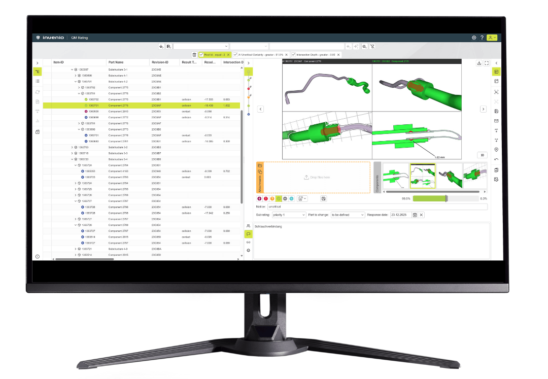 With its AI-powered Quality-Monitor, invenio Virtual Technologies offers the leading solution for virtual geometric validation of digital prototypes. The software reliably identifies, evaluates, documents and communicates geometric conflicts such as collisions, clearance violations, free-flying components and more – fully automated and AI-supported.